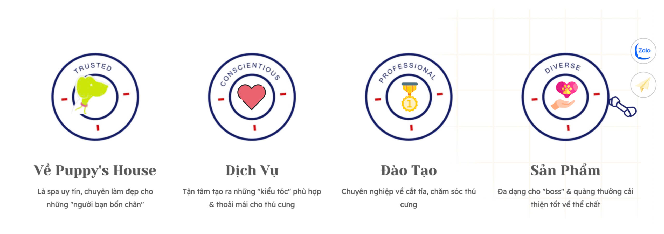 Cún, mèo không chỉ đơn thuần là vật nuôi, với những người thương yêu động vật, chúng được xem như người bạn đồng hành, một thành viên trong gia đình để san sẻ buồn vui. Cũng như bạn, chúng cần được chăm sóc cả về sức khoẻ thể chất lẫn tinh thần. Một “chiếc Boss” hoạt bát, một “Quàng thượng” vui tươi khi được ăn uống đầy đủ dưỡng chất, được cắt tỉa gọn gàng, được tắm gội thơm tho và nhận được tình yêu thương chân thành từ các “Sen”. Tại Puppy’s House, chúng tôi thấu hiểu điều đó và luôn sẵn sàng mang đến đa dạng dịch vụ, từ tắm gội, chải chuốt, cắt tỉa, tạo kiểu cho những “người bạn bốn chân”. Mỗi dịch vụ của chúng tôi đều được thực hiện kỹ lưỡng nhằm đảm bảo sự an toàn, thoải mái cho những “vị khách đặc biệt” lẫn sự an tâm cho các bậc “phụ huynh”.